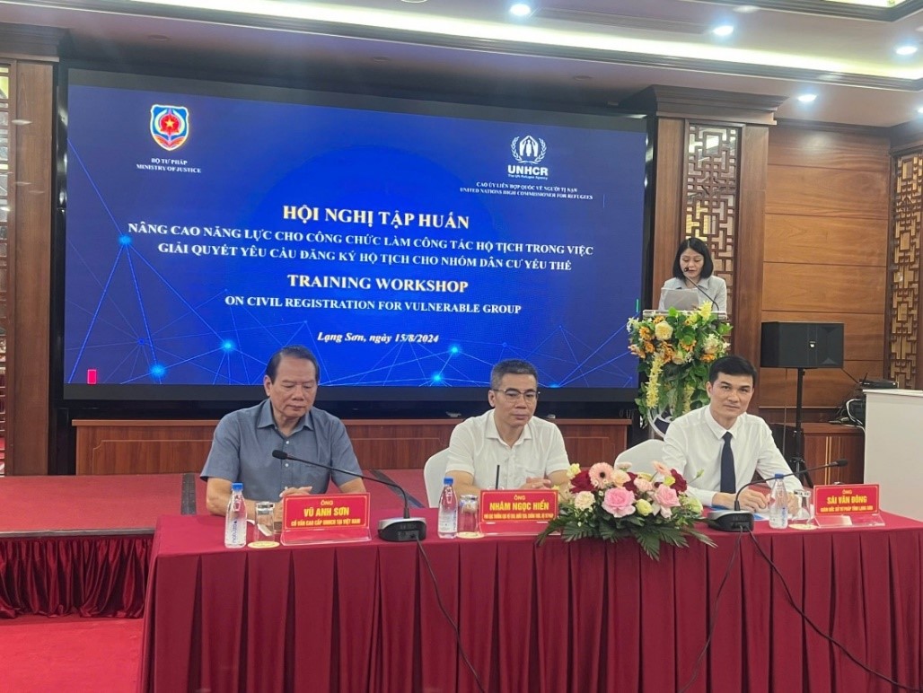 Tham dự hội nghị tập huấn, đồng chủ trì có đồng chí Nhâm Ngọc Hiển - Phó Cục trưởng Cục Hộ tịch, quốc tịch, chứng thực – Bộ Tư pháp; ông Vũ Anh Sơn - đại diện Cao ủy liên hợp quốc về người tị nạn tại Việt Nam (UNHCR).