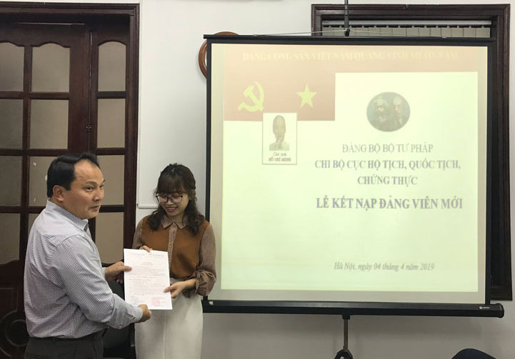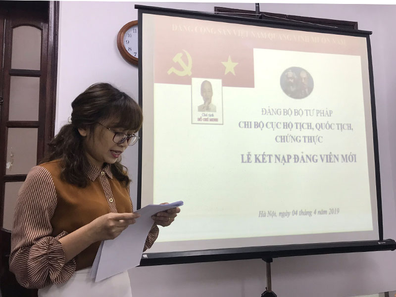 Tham dự buổi lễ có đồng chí Đảng ủy viên, Bí thư Chi bộ, Cục trưởng Cục Hộ tịch, quốc tịch, chứng thực Nguyễn Công Khanh và toàn thể đảng viên của Chi bộ Cục Hộ tịch, quốc tịch, chứng thực. Thay mặt Chi bộ, đồng chí Bí thư đã công bố quyết định của Ban thường vụ Đảng uỷ Bộ Tư pháp và trao Quyết định cho đảng viên mới Nguyễn Thu Thảo.