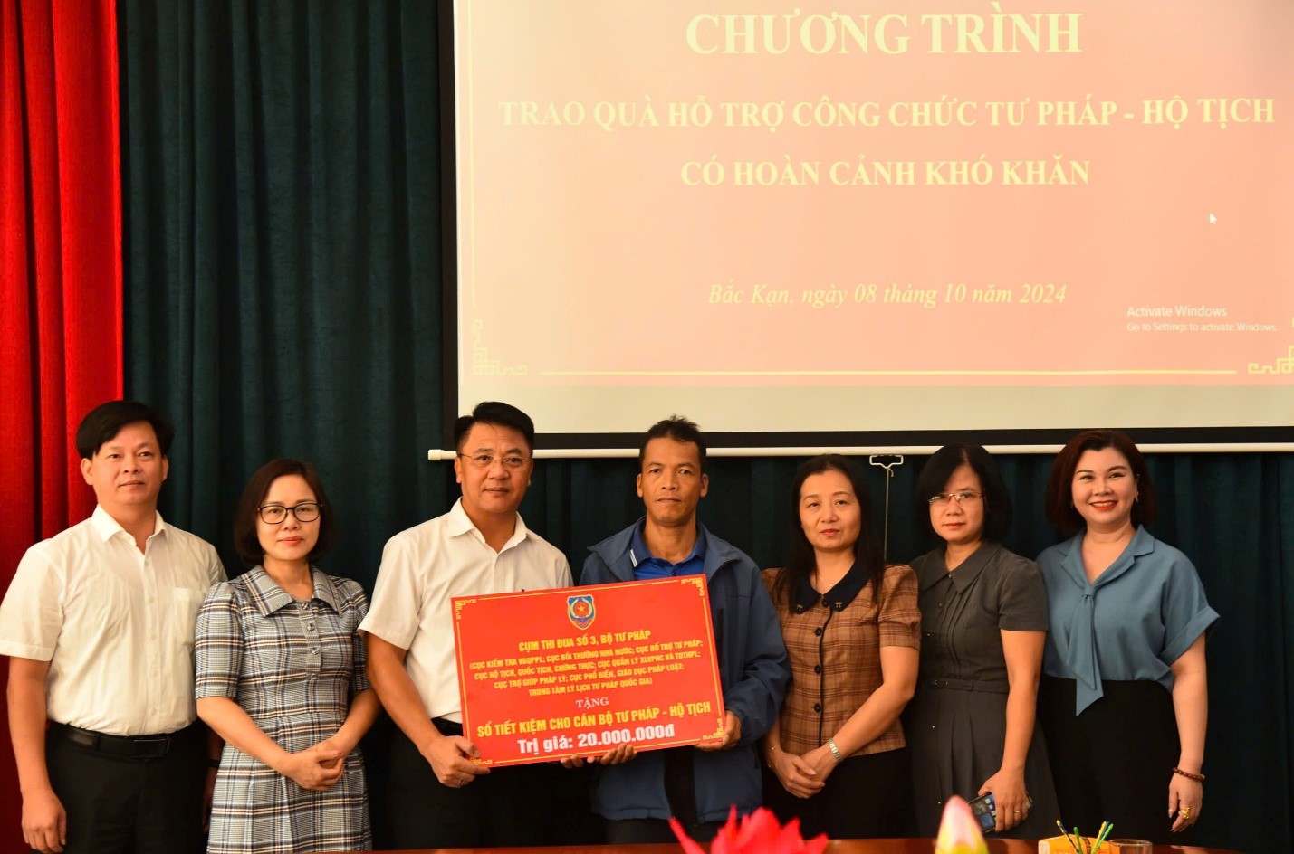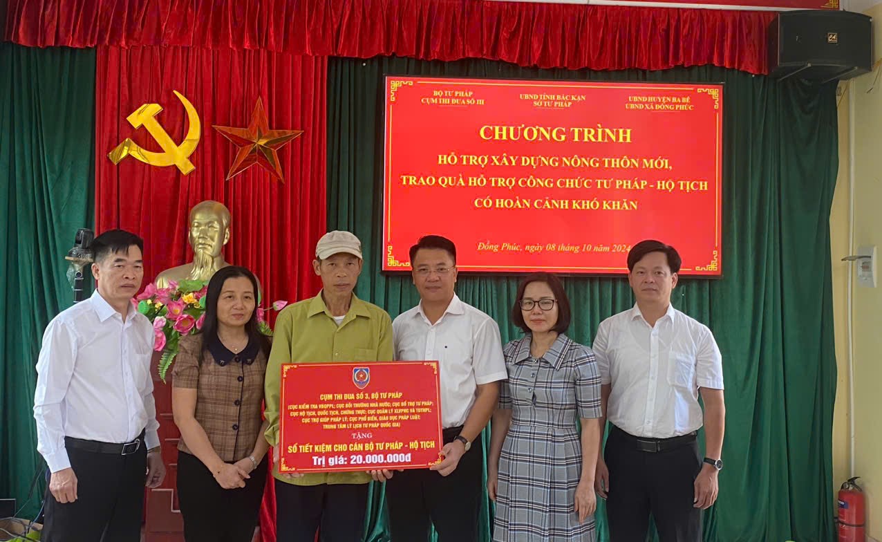 Trong khuôn khổ chương trình, Cụm thi đua số III, Bộ Tư pháp và Sở Tư pháp tỉnh Bắc Kạn đã hỗ trợ thôn Nà Cà, xã Đồng Phúc, Huyện Ba Bể 25 triệu đồng để xây dựng nông thôn mới. Đồng thời, Cụm thi đua số III, Bộ Tư pháp cũng trao tặng 02 sổ tiết kiệm, mỗi sổ trị giá 20 triệu đồng cho 02 công chức tư pháp – hộ tịch là ông Trịnh Văn Mạnh, công chức tư pháp – hộ tịch xã Yên Hân, huyện Chợ Mới, tỉnh Bắc Kạn và ông Lường Thanh Sơn, công chức Tư pháp - Hộ tịch xã Yên Phong, huyện Chợ Đồn, tỉnh Bắc Kạn